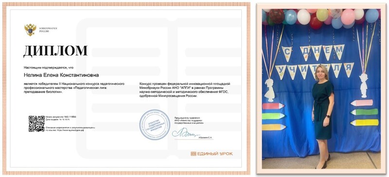 16.10.2025 г. учитель биологи и химии Нелина Елена Константиновна получила диплом победителя II Национального конкурса педагогического профессионального мастерства «Педагогическая лига: преподавание биологии». Организованным Минобрнауки России.