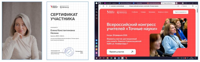 28.02.2026 г. учитель биологии и химии Нелина Елена Константиновна приняла участие дистанционно в работе Всероссийского конгресса учителей «Точные науки», проводимого благотворительным фондом СКБ Контур под руководством Уральского федерального университета.
