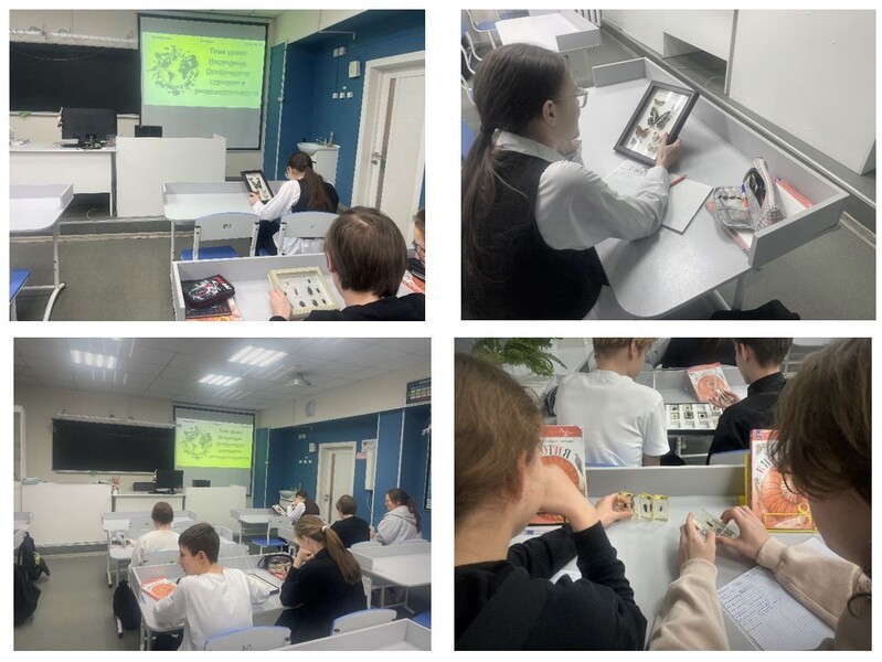 Рассматривая коллекцию насекомых «Представители отряд бабочки (Чешуекрылые)», «Представители отряда насекомых», школьники изучили характерные признаки класса, внешнее и внутреннее строение, разнообразие ротовых аппаратов и типы развития.