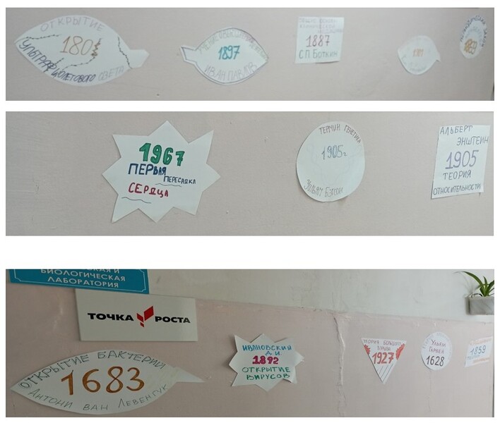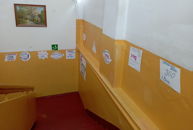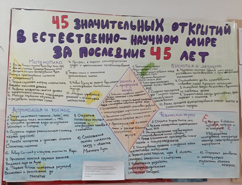 Была оформлена и размещена в рекреациях школы большая панорама «45 важнейших естественно-научных открытий», которую подготовила вместе с учащимися педагог дополнительного образования Лукашевич Ольга Анатольевна, работающая по программе «Юный эколог».